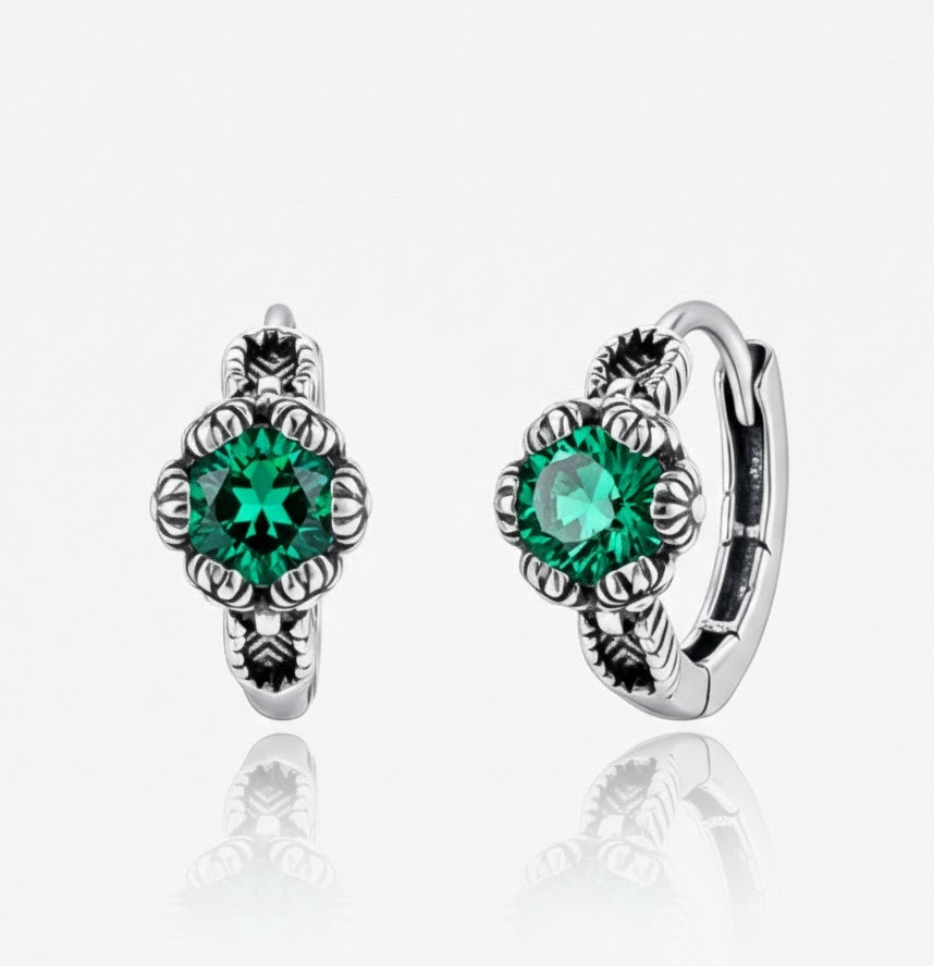 深いグリーンの天然エメラルドを中央に配し、花のようなクラシカルデザインで仕上げたプラチナフープピアス。精緻なミルグレイン装飾がエメラルドの色彩を引き立て、上品でアンティークな雰囲気を醸し出します。