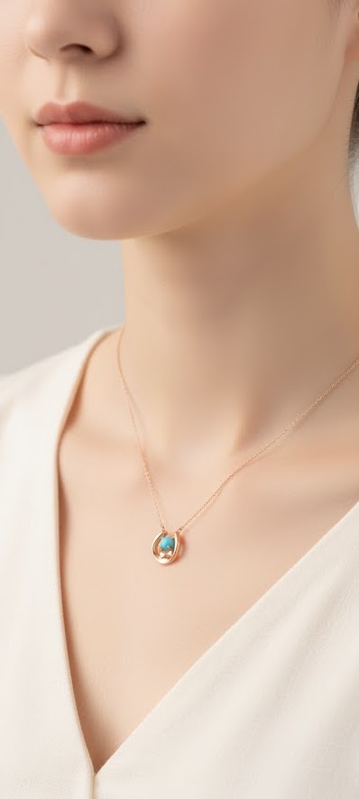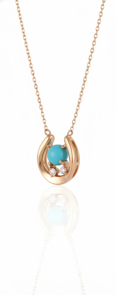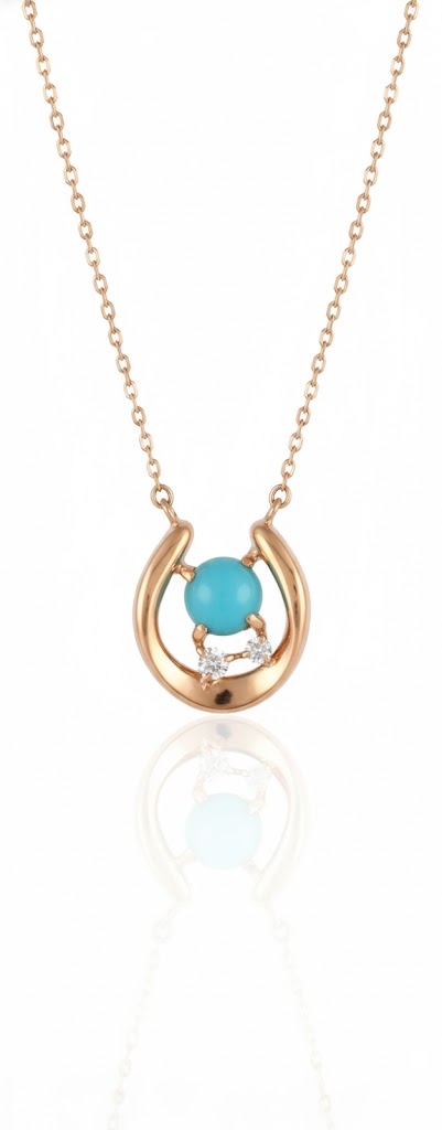 ターコイズの澄んだ青が胸元に清涼感を与え、ローズゴールドの柔らかな輝きが肌に溶け込むように映えます。馬蹄のカーブが優しい印象を演出し、幸福や守護の意味を持つお守りジュエリーとしても人気。