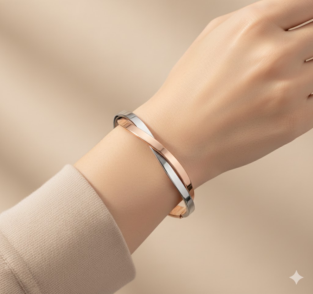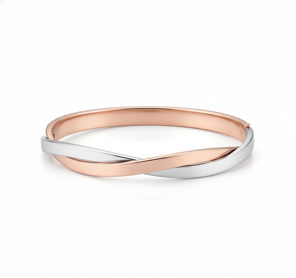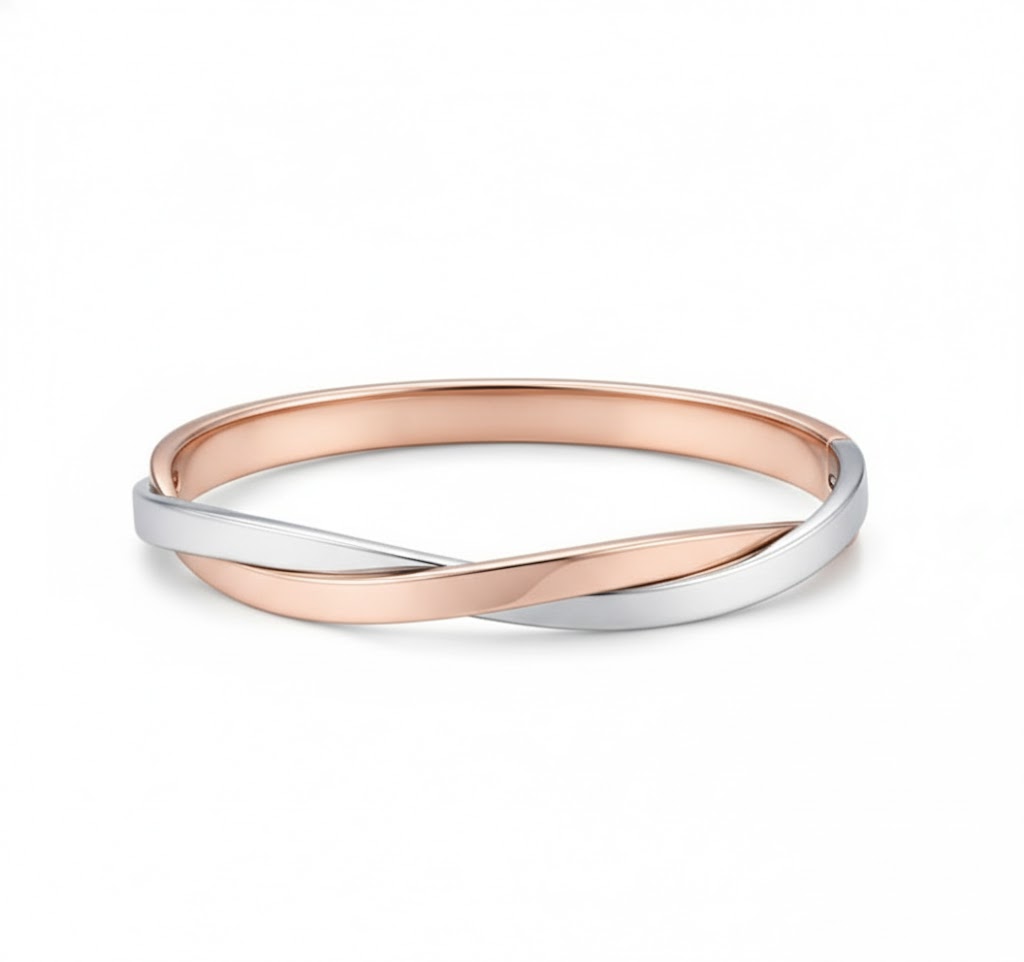 K18ピンクゴールドとK18ホワイトゴールドを美しく交差させたツイストデザインのバングル。柔らかく流れるようなラインが手首に寄り添い、上品で洗練された印象を与えます。