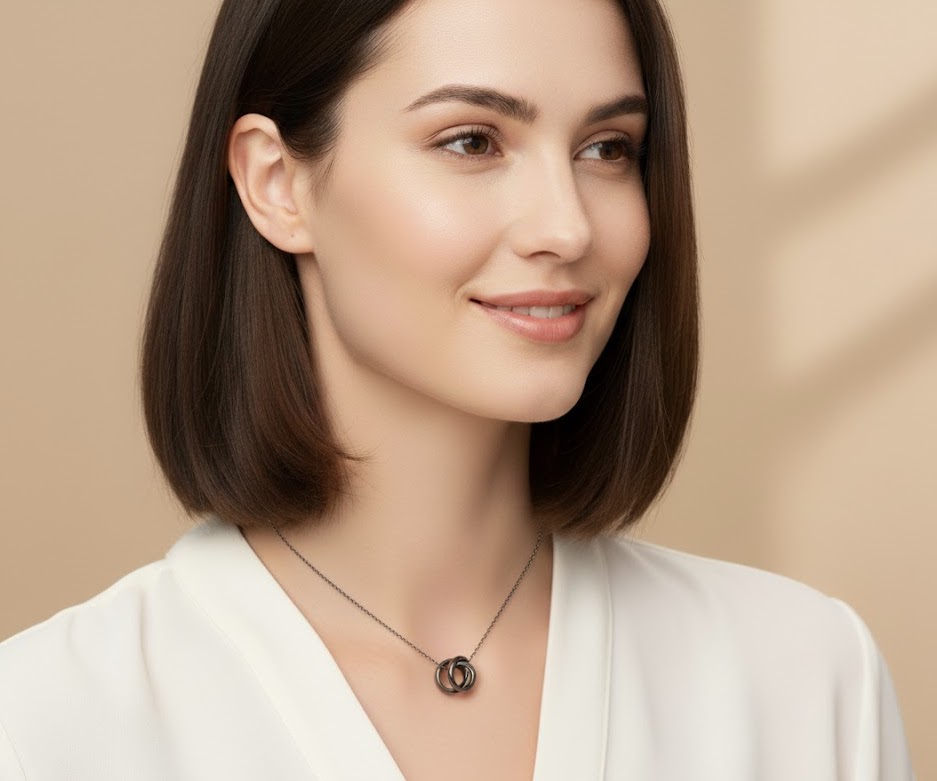 3つのリングが互いに絡み合う、永遠の絆を象徴するトリニティデザインのネックレス。