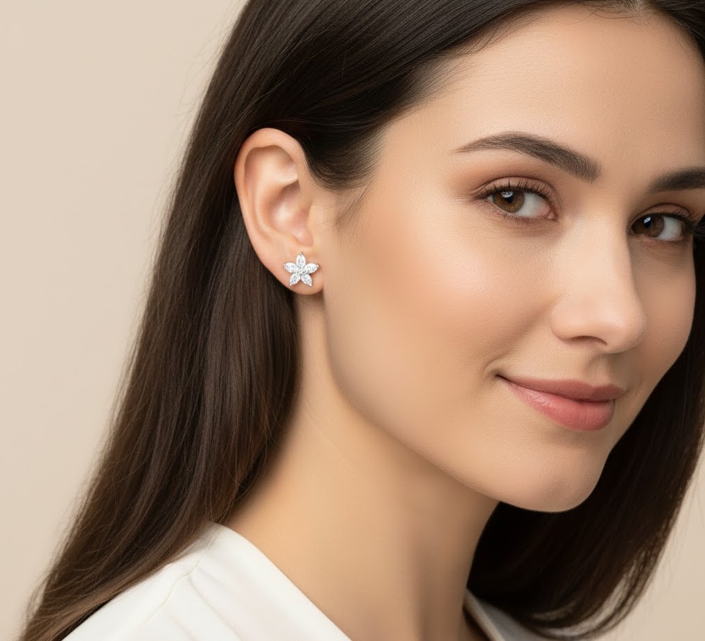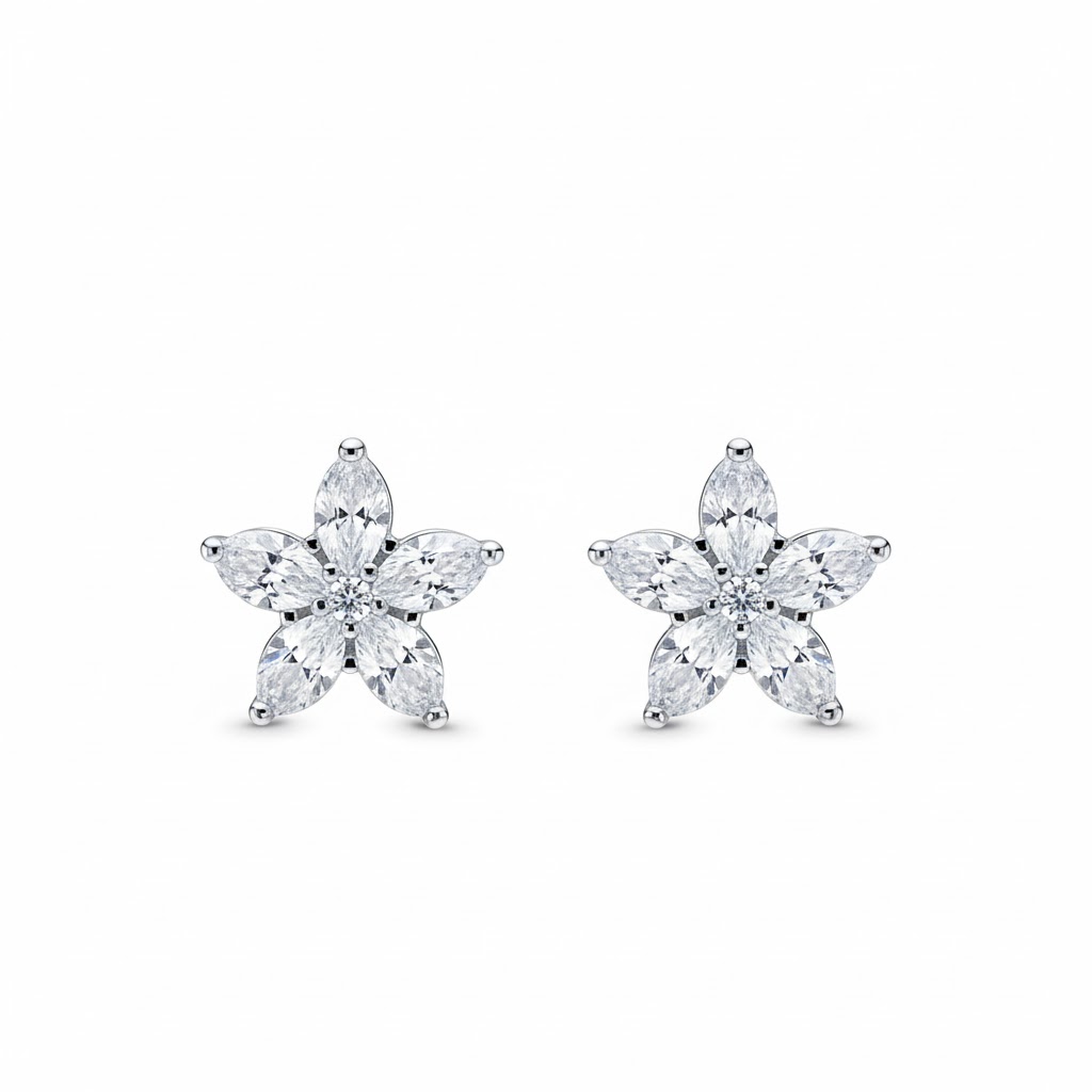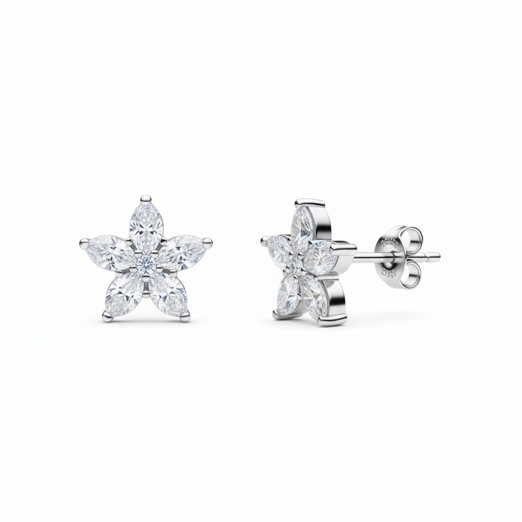 マーキスカットの天然ダイヤモンドを花びらのようにセッティングした、繊細で気品あふれるプラチナピアス。5枚の花びらが放つ光が調和し、まるで一輪の花が咲くような輝きを生み出します。Pt950の台座はダイヤモンドの透明感を際立たせ、フォーマルにもデイリーにも馴染むデザイン。
