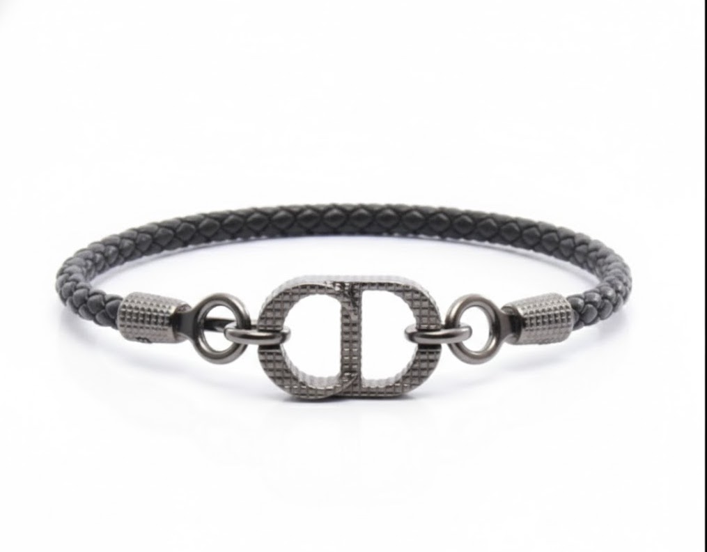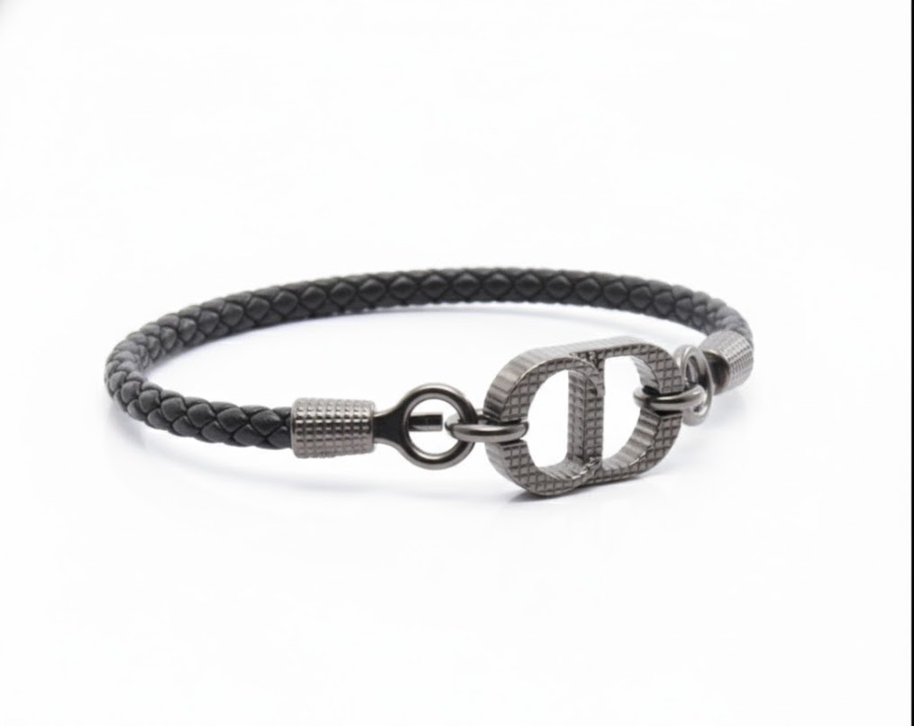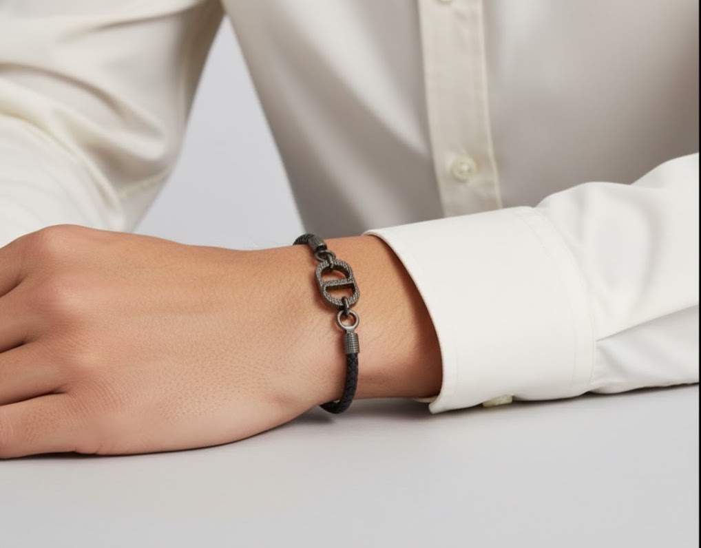 中央のダブルリンクモチーフは、結びつきと信頼を象徴するデザインで、細やかなテクスチャ加工により重厚感を漂わせます。レザー部分は高品質なカーフレザーを丁寧に編み込み、柔らかさと耐久性を両立。