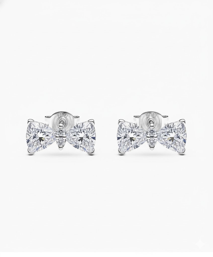 三角カットのダイヤモンドをリボンの形にセッティングした、繊細で愛らしいデザインのピアス。中央にはメレダイヤをあしらい、可憐さの中に高級感を添えています。台座には上質なプラチナ(Pt950)を使用し、ダイヤモンドの透明感を最大限に引き立てる仕上げ。