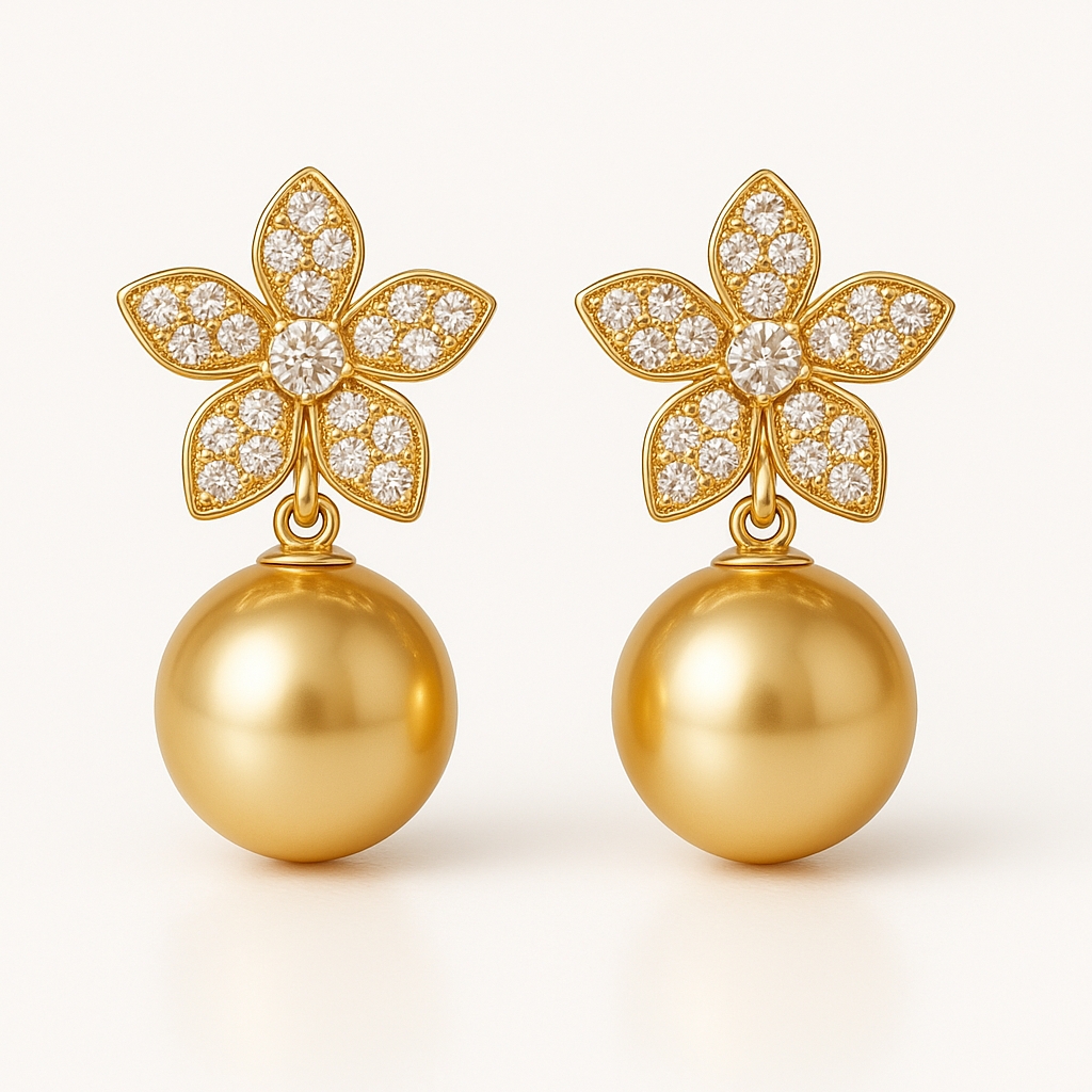 メレダイヤは合計0.30ct、パールは照り・巻きともに最高品質の南洋ゴールデンパールを厳選。職人が一つひとつ丁寧にセッティングし、花びらの立体感とパールの光沢が調和するよう仕上げられています。