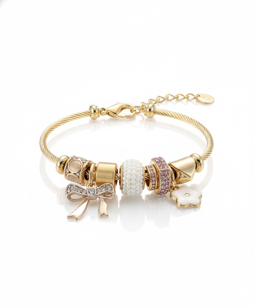ピンクサファイアとパール、リボンチャームが輝くK18ゴールドブレスレット。可憐で華やかな大人のフェミニンスタイルを演出します。