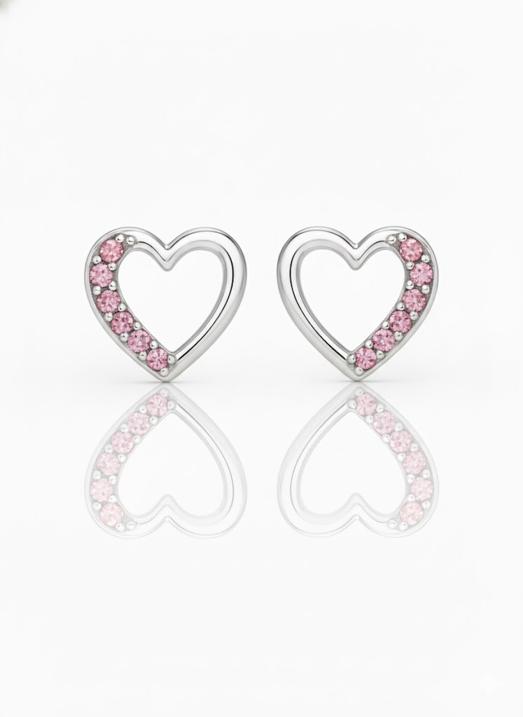 愛らしいオープンハートモチーフに、上質なピンクサファイアを片側にセッティングしたK18ホワイトゴールドピアス。